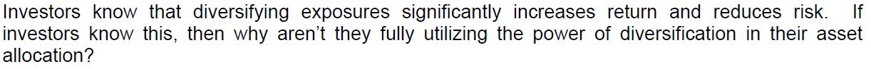 투자자들은 노출을 다각화하면 수익률이 크게 증가하고 위험이 줄어든다는 것을 알고 있다. 만약 투자자들이 이를 알고 있다면, 왜 그들은 분산된 자산배분의 힘을(Power of diversification in their asset allocation)을 충분히 활용하지 못하는 것일까?
