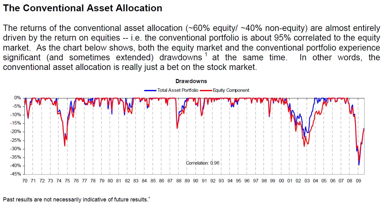 전통적인 자산배분(~60% 주식/~40% 주식이외 자산)의 수익은 거의 주식 수익에서 나온다.- 즉, 전통적인 포트폴리오가 주식과 약 95% 상관된다. 아래 차트가 보여주듯이, 주식시장과 전통적인 포트폴리오는 동시에 중요한 Drawdowns을 경험하였다. 다시 말해, 전통적인 자산배분은 주식시장에 베팅하는 것이다.