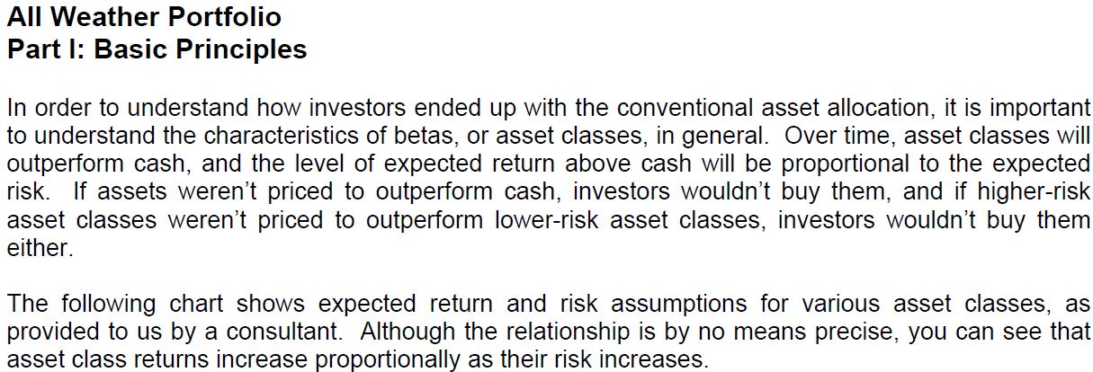 투자자들이 어떻게 전통적인 자산배분을 하게 되었는지를 이해하기 위해서는 보통 베타,자산군의 특성을 이해는 것은 중요한 일이다. 시간이 지남에 따라 자산군은 현금을 능가(outperform)하며, 현금보다 높은 기대수익률은 리스크에 비례할 것이다. 만약 자산이 현금을 능가(outperform)하도록 가격이 매겨지지 않는다면, 투자자들은 그것을 사지 않을 것이고, 만약 위험성이 더 높은 자산군이 위험성이 낮은 자산 클래스를 능가(outperform)하도록 가격이 책정되지 않는다면, 투자자가 구매하지 않을 것이다.