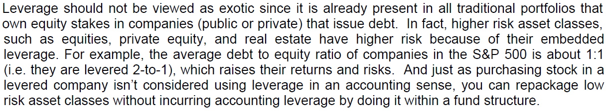 레버리지가 이미 모든 전통적인 포트폴리오에 존재하기 때문에 이국적인 것으로 간주되어서는 안 된다. (전통적인 포트폴리오는 주식을 포함하고 있고, 주식은 회사의 지분을 가지는 것이므로 주식을 소유하는 것은 회사의 레버리지 또한 일부 소유하는 것, 자산 = 자본 + 부채) 사실, 더 높은 위험 자산군 - 주식, 사모, 부동산과 같은 것들은 레버리지가 내재되어 있기 때문에 더 높은 위험성을 가지고 있다. 예를 들어 S&P 500에서 기업의 평균 부채비율은 약 1:1이다. (즉, 2 대 1로 레버리지됨)하여 수익과 위험을 높인다.