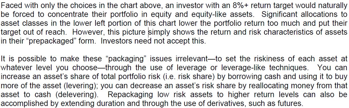 위의 차트의 선택사항에 직면했을 때, 8% 이상의 수익 목표를 가진 투자자는 자연스럽게 그들의 포트폴리오를 주식과 주식과 같은 자산에 집중하도록 강요당한다. 이 차트 왼쪽 하단에 있는 자산군에 대한 큰 할당은 포트폴리오 수익률을 너무 많이 낮추고 목표를 달성할 수 없게 한다. 그러나 이 그림은 단순히 자산의 수익과 위험 특성을 사전 포장된 형태로 보여준다. 투자자들은 이것을 받아들일 필요가 없다.