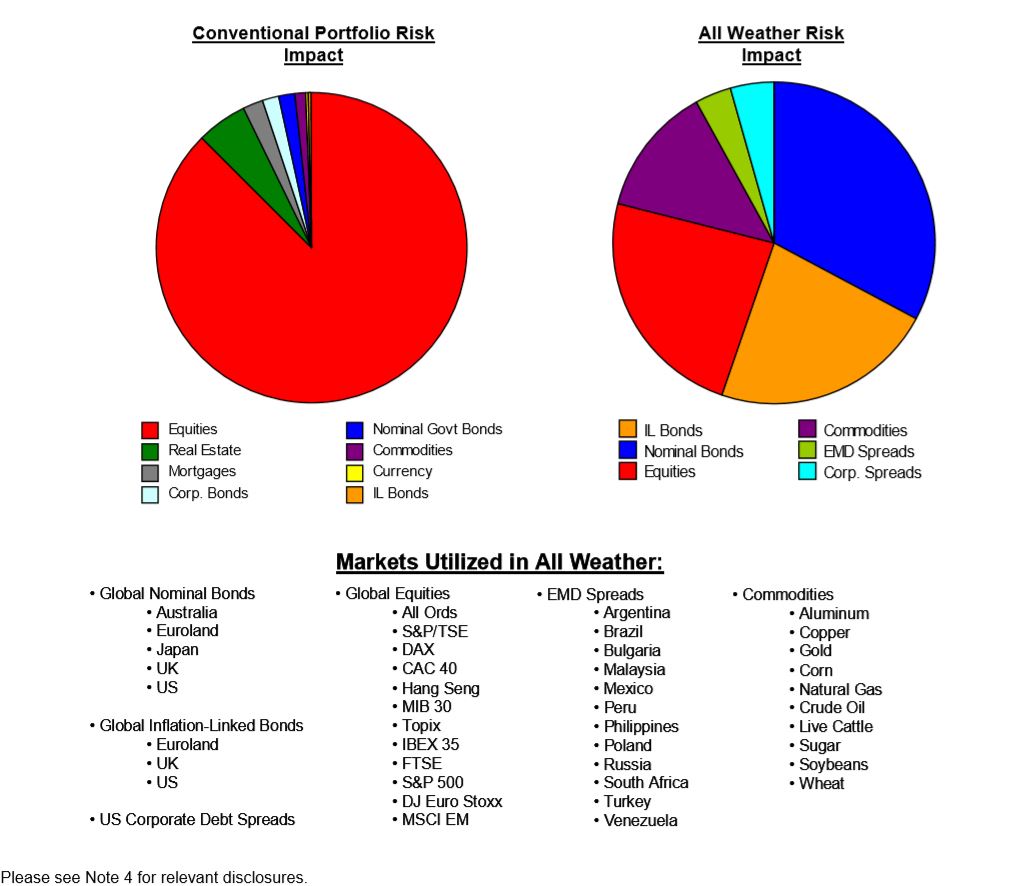 올웨더 포트폴리오의 리스크를 서로 다른 환경에 분산시키는 것 외에도, 우리는 또한 각 환경 내에서 다각화를 극대화한다. 각 환경에 대해 우리는 자산군을 혼합하고, 각 자산군은 세계적으로 다각화된다. 총 40개 이상의 시장에 투자한다. 그 결과 기존 포트폴리오보다 자산군과 전반에 걸쳐 균형이 잡힌 포트폴리오가 탄생하였다.