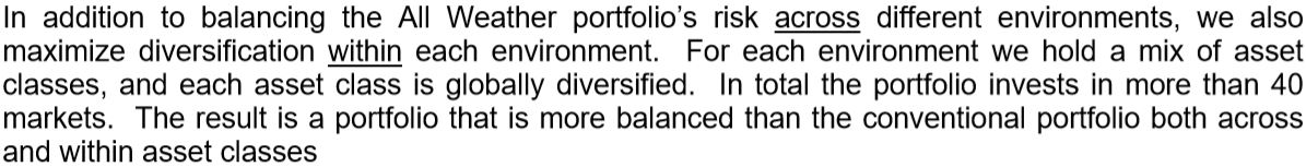 이러한 이해를 이용하여, 우리는 주어진 환경에서 주어진 자산 클래스(예: 명목 채권)의 underperform하는자산(예: 높은 인플레이션)이 우리가 알고 있는 다른 자산 클래스(예: 상품)의 성과에 의해 자연스럽게 상쇄될 수 있도록 여러 환경 간에 자산군의 균형을 맞춘다. 분명히 말하자면, 이것은 총 수익률이 0이라는 것을 의미하지 않는다; 올웨더는 각 자산군에 내재된 위험 프리미엄을 수집함으로써 각 경제 환경에서 일관된 긍정적인 수익(Positive return)을 창출하도록 설계되어 있다.