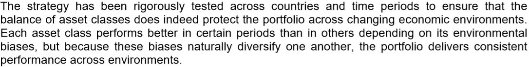 이 전략은 자산군의 균형이 변화하는 경제 환경 전반에 걸쳐 포트폴리오를 진정으로 보호하도록 보장하기 위해 국가 및 기간에 걸쳐 철저하게 시험되었다. 각 자산군은 환경적 성향에 따라 다른 기간에 비해 특정 기간에 더 나은 성능을 발휘하지만, 이러한 편향이 자연스럽게 서로 다각화되기 때문에 포트폴리오가 환경 전반에 걸쳐 일관된 성능을 제공한다.
