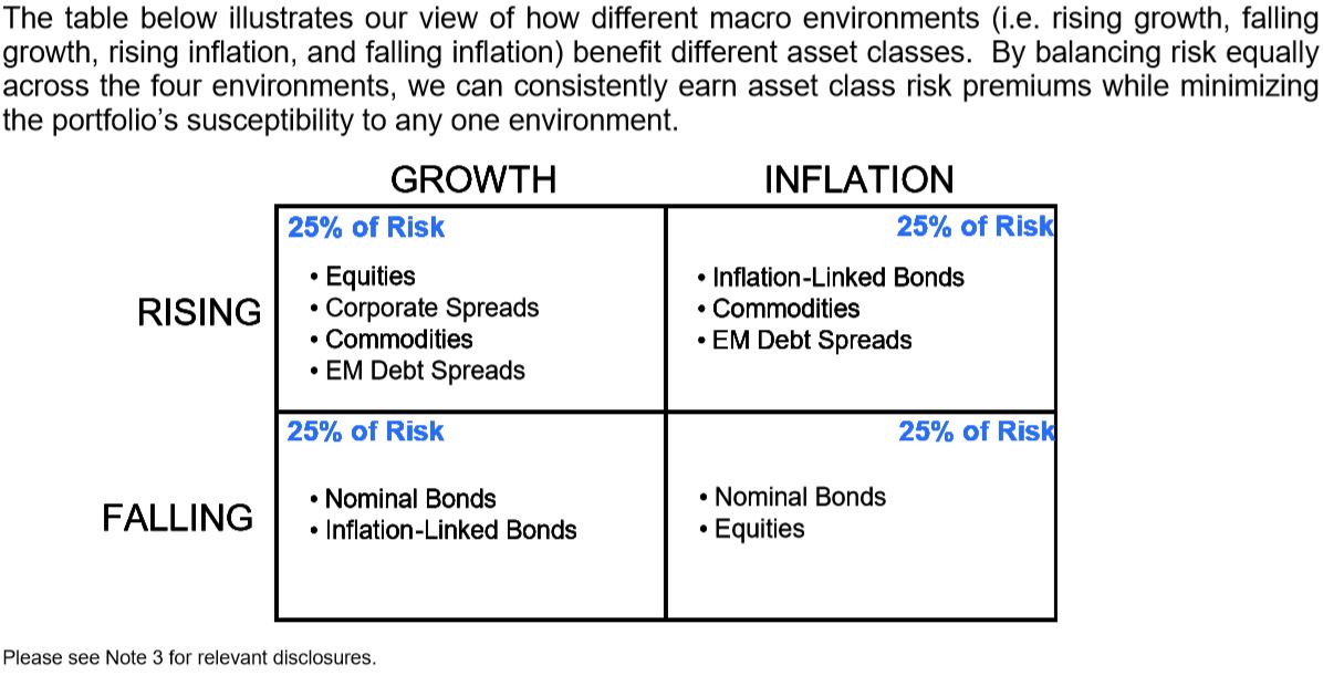 아래 표는 서로 다른 매크로 환경(즉, 상승하는 성장, 하락하는 성장, 상승하는 인플레이션, 하락하는 인플레이션)이 어떻게 서로 다른 자산군에 이익을 주는가에 대한 우리의 관점을 보여준다. 리스크를 네 가지 환경 간에 균등하게 분산시킴으로써, 우리는 포트폴리오의 어느 한 환경에 대한 취약성을 최소화하면서 자산군의 리스크 프리미엄을 일관되게 획득할 수 있다.