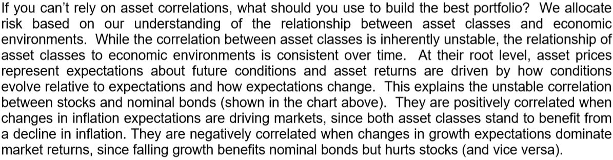자산 상관 관계에 의존할 수 없는 경우 최고의 포트폴리오를 구축하기 위해 무엇을 사용해야 하는가? 우리는 자산군과 경제 환경 간의 관계에 대한 이해에 기초하여 위험을 할당한다. 자산군 간의 상관관계는 본질적으로 불안정하지만, 경제 환경에 대한 자산 계층의 관계는 시간이 지남에 따라 일관된다. 근본적으로 자산가격은 미래 상태에 대한 기대를 나타내고 자산수익은 기대치에 비해 상황이 어떻게 진화하고 기대가 어떻게 변하느냐에 따라 결정된다. 이것은 주식과 명목 채권 사이의 불안정한 상관관계를 설명한다(위 도표에 표시). 두 자산 모두 인플레이션 감소의 혜택을 받기 때문에 인플레이션 기대의 변화가 시장을 주도할 때 그들은 양의 상관관계(Positively correlated)가 있다. 성장 기대치의 변화가 시장 수익을 지배할 때, 성장 감소는 명목 채권에 이익을 주지만 주식에 해를 끼치기 때문에 음의 상관관계(Negatively correlated)가 있다.