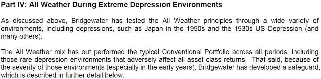 위에서 논의한 바와 같이 브릿지워터는 1990년대 일본 및 1930년대 미국 대공황과 같은 침체를 포함한 환경 등매우 다양한 환경에서 올웨더 원칙을 시험했다. All Weather는 모든 자산군에 부정적인 영향을 미치는 드문 경기침체를 포함한 모든 기간에 걸쳐 전통적인 포트폴리오를 능가하였다. 이러한 환경의 심각성(특히 초기 몇 년 동안)때문에, Bridgewater는 보호장치를 개발했다. 아래에 자세히 설명되어 있다.