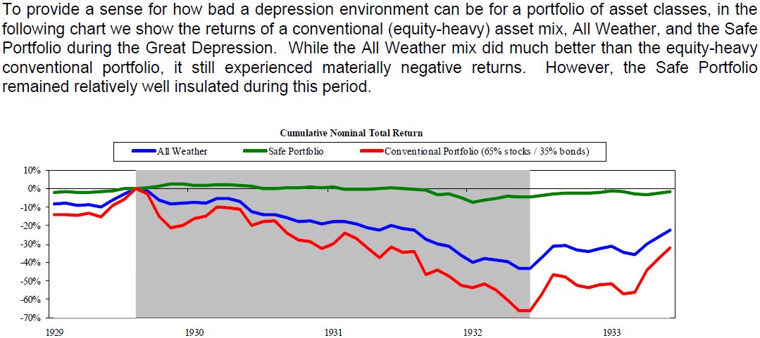 자산군 포트폴리오에 대해 불황이 얼마나 나쁜지를 감지할 수 있는 방법을 제공하기 위해 다음 차트에서 경제대공황 시기에 전통적인 자산 혼합의 수익, 올웨더, 안전 포트폴리오의 수익을 보여준다. 올웨더 전략은 주식비중이 큰 전통적 포트폴리오보다 좋은 성과를 내었지만, 그것은 여전히 상당히 부정적인 수익을 경험했다. 하지만 안전 포트폴리오는 이 기간 동안 비교적 잘 보호되었다.