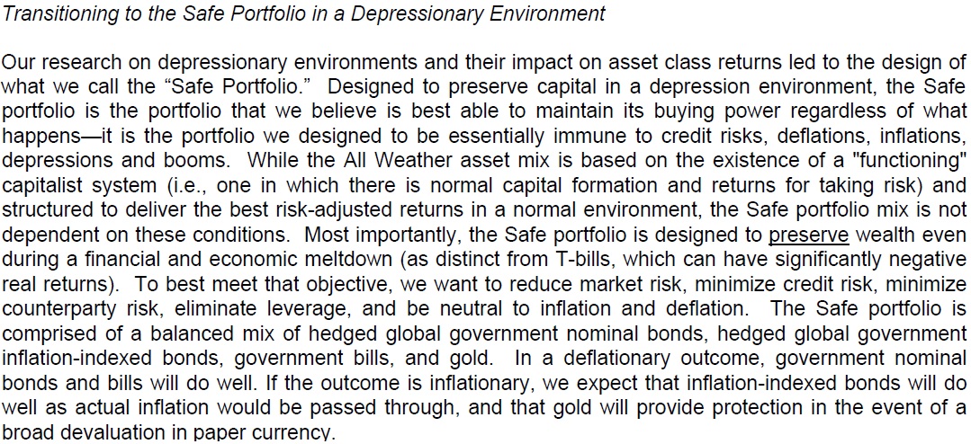 가장 중요한 것은, 안전 포트폴리오는 금융 및 경제 붕괴동안 (T 빌과는 별개로서, 상당한 손실이 있을 수 있음) 부를 보존하기 위해 설계되었다는 점이다. 이러한 목표를 최적으로 충족하기 위해 우리는 시장 위험을 줄이고, 신용 위험을 최소화하며, 거래상대방 리스크를 최소화하며, 레버리지(지렛대)를 없애고, 인플레이션과 디플레이션에 중립을 취한다. 안전 포트폴리오는 글로벌 정부 명목 채권(hedged), 글로벌 정부 물가연동채권(hedged), government bills, 와 금 균형 잡힌 조합으로 구성된다. 디플레이션 결과, 정부 명목 채권과 Bills는 성과가 좋을 것이다. 만약 그 결과가 인플레이션이라면, 우리는 물가 연동 채권이 효과가 있을 것으로 기대한다. 실제 인플레이션이 발생하면 지폐의 대폭적인 평가 절하는 금을 통해 보호될 것이다.