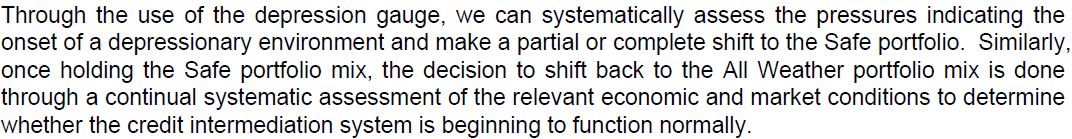 불황 게이지의 사용을 통해, 우리는 불황의 시작을 체계적으로 평가하고 안전 포트폴리오로 부분 또는 전체 전환할 수 있다. 유사하게 일단 안전 포트폴리오 믹스를 보유하게 되면, 관련 경제 및 시장 상황을 지속적으로 체계적으로 평가 및 신용 조정 시스템이 정상적으로 작동하기 시작하는지 여부를 결정하여 All Weather 포트폴리오로의 전환 결정이 이루어진다.