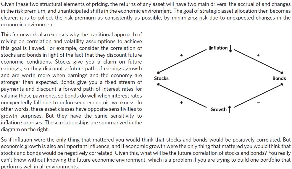 이 프레임워크는 또한 왜 상관관계 및 변동성 가정에 의존하는 전통적인 접근방식이 달성하고자 하는 목표가 왜 결점이 있는지 보여준다. 예를 들어 주식과 채권의 상관관계를 미래를 할인한다는 점에 비추어 생각해보자. 주식은 당신에게 미래 수익에 대한 권리를 주므로, 그들은 미래의 수익 성장 계획을 할인한다. 그리고 수익과 경제가 기대보다 좋을 때 더 가치가 있다.