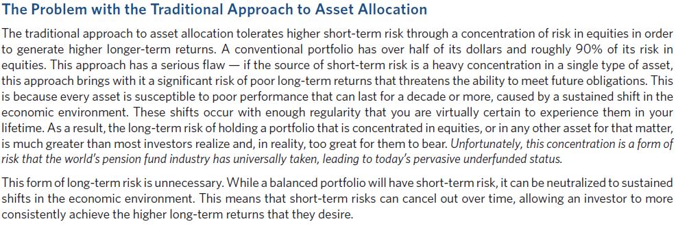 자산배분에 대한 전통적인 접근법은 더 높은 장기 수익을 창출하기 위해 주식에 집중하고, 단기적 높은 리스크는 용인한다. 전통적인 포트폴리오는 포트폴리오의 절반을 주식에 투자하였고, 총리스크의 90%가 주식에서 나온다. 이 접근법은 심각한 결함을 가지고 있다. 단기간 위험의 근원이 단일 유형의 자산에 집중되어 있는 경우, 이러한 접근방식은 미래의 의무를 이행하는 능력을 위협하며 형편없는 장기적 수익률을 가져올 수 있다. 왜냐하면 모든 자산은 경제환경의 지속적인 변화로 인해 열악한 실적이 10년 이상 형편없는 성과가 지속되는 상황이 있을 수 있다.
