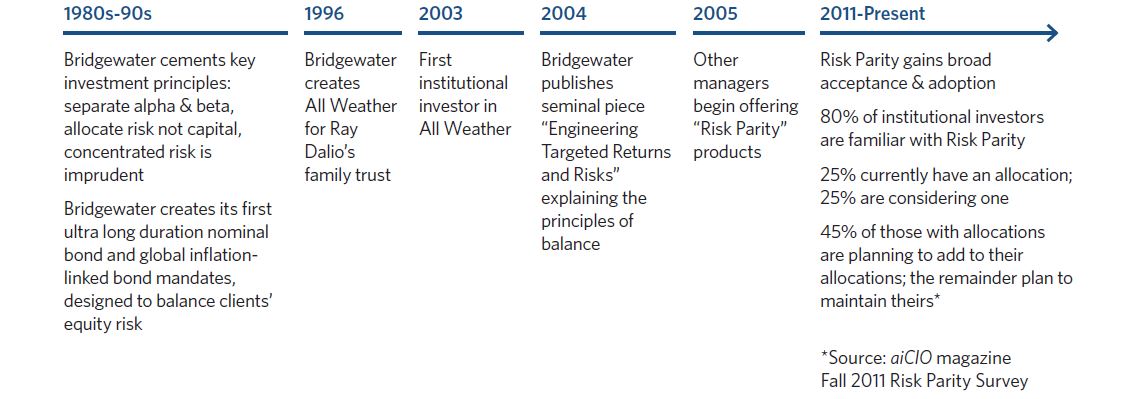 Bridgewater Associates는 20년 전, 1996년 All Weather 자산배분 전략의 수립으로 결실을 맺은 포트폴리오 균형 개념을 개척했다. 최근, "리스크 패리티"라는 이름으로, 몇몇 매니저들이 이러한 개념들 중 일부에 근거한 전략을 제시하기 시작했다. 투자자들이 집중된 포트폴리오가 수익 요구사항을 충족하기 위해 위험하고 불필요하다는 것을 점점 더 많이 인식함에 따라 보다 균형 잡힌 자산 배분 전략의 채택이 기관 투자계에서 급증했다.