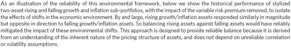 이 환경 프레임워크의 신뢰성에 대한 예로서, 아래에서는 가변 위험 프리미엄의 영향을 제거한 스타일화 된 2 자원의 상승 및 하강 성장 및 인플레이션 하위 포트폴리오의 역사적 성과를 보여 경제 환경의 변화에 따른 영향을 분리한다. 대체로 상승하는 성장/인플레이션 자산은 감소하는 성장/인플레이션 자산과는 반대되는 규모에서 비슷하게 대응했다. 따라서 증가하는 자산과 감소하는 자산의 균형을 맞추는 것은 이러한 환경 변화의 영향을 안정적으로 완화시킬 수 있었을 것이다. 이 접근법은 자산의 가격결정 구조의 본질적 특성에 대한 이해에서 도출되며, 신뢰성 없는 상관관계나 변동성 가정에 의존하지 않기 때문에 신뢰성 있는 균형을 제공하도록 설계되었다.