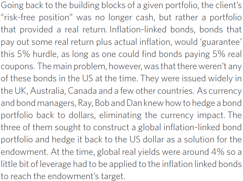 주어진 포트폴리오의 구성 요소로 돌아가서, 고객의 "위험이 없는 포지션"은 더 이상 현금이 아니라, 실질적인 수익을 제공하는 포트폴리오였다. 실질 수익률과 실제 인플레이션을 더한 물가연동 채권은 5%의 실제 쿠폰을 지불하는 채권을 찾을 수 있다면 이 5%의 허들을 '보증'하게 될 것이다. 그러나 주된 문제는 그 당시 미국에는 이러한 채권들이 전혀 없었다는 것이었다. 그것들은 영국, 호주, 캐나다 그리고 몇몇 다른 나라들에서 널리 발행되었다. 통화와 채권 관리자로서, Ray, Bob, Dan은 어떻게 하면 채권 포트폴리오를 달러화 대비 헤지 할 수 있는지 알고 있었고, 통화에 미치는 영향을 없앴다. 이들 3명은 글로벌 인플레이션 연계 채권 포트폴리오를 구축하여 5%의 실제 수익을 위한 해결책으로 미 달러화에 다시 헷지 하려 했다. 당시 전 세계 실질 수익률은 4% 정도여서 인플레 연계 채권에 약간의 레버리지를 적용해야 목표(5%)에 도달할 수 있었다.