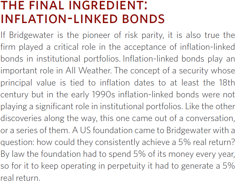 브리지워터가 리스크 패리티의 선구자라면 이 회사가 기관 포트폴리오에서 인플레이션 연계 채권을 승인하는 데 중요한 역할을 한 것도 사실이다. 물가연동 채권은 올웨더에서 중요한 역할을 한다. 원금이 인플레이션과 결부되어 있는 보장의 개념은 적어도 18세기로 거슬러 올라가지만, 1990년대 초에는 인플레이션 관련 채권이 기관 포트폴리오에서 중요한 역할을 하지 못했다. 도중에 발견된 다른 발견들과 마찬가지로, 이 발견은 대화, 즉 일련의 이야기에서 나왔다. 미국의 한 재단이 브릿지워터(Bridgewater)에 와서 어떻게 지속적으로 5%의 실제 수익을 달성할 수 있을까? 법으로 재단은 매년 5%의 돈을 써야 했기 때문에 영구적으로 계속 운영하기 위해서는 5%의 실제 수익을 창출해야 했다.