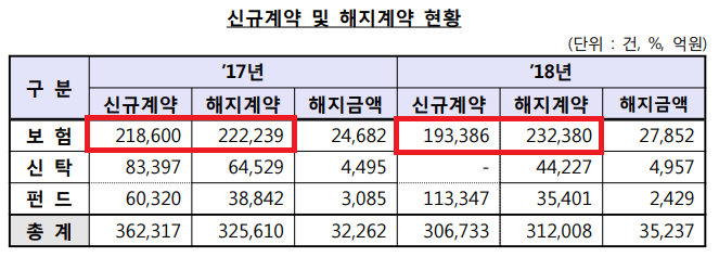 2018년도에는 신규계약건수보다 해지 계약건수가 많았습니다. 많은 분들이 계속 납입하는 게 어렵지 않을 것이라고 생각하고 무심하게 가입하지만, 통계는 다른 사실을 말해주죠.
