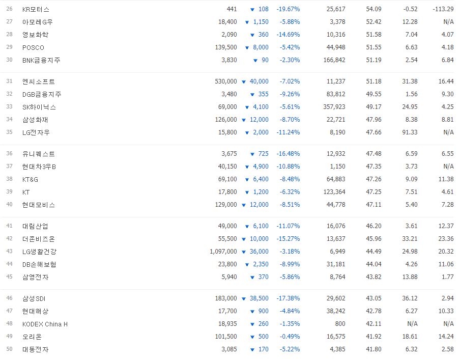 비관이 극에 달했을때에는 나쁜소식에도 더 이상 하락하지 않는다고 하던데, 그때가 언제일까요. 현재상황은 거리에 피가 낭자하다고 생각되긴합니다.