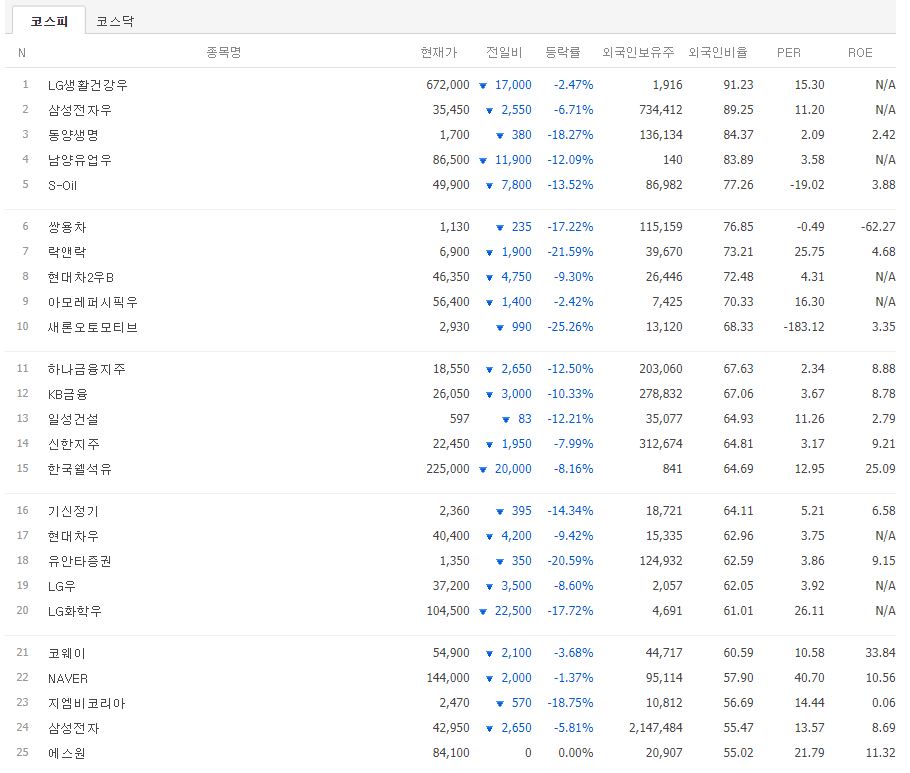 외국인매도가 끝없이 이어지고 있어서 언제까지 팔까 싶습니다. 그래서 외국인 보유현황을 살펴보았습니다. (https://finance.naver.com/sise/sise_foreign_hold.nhn)