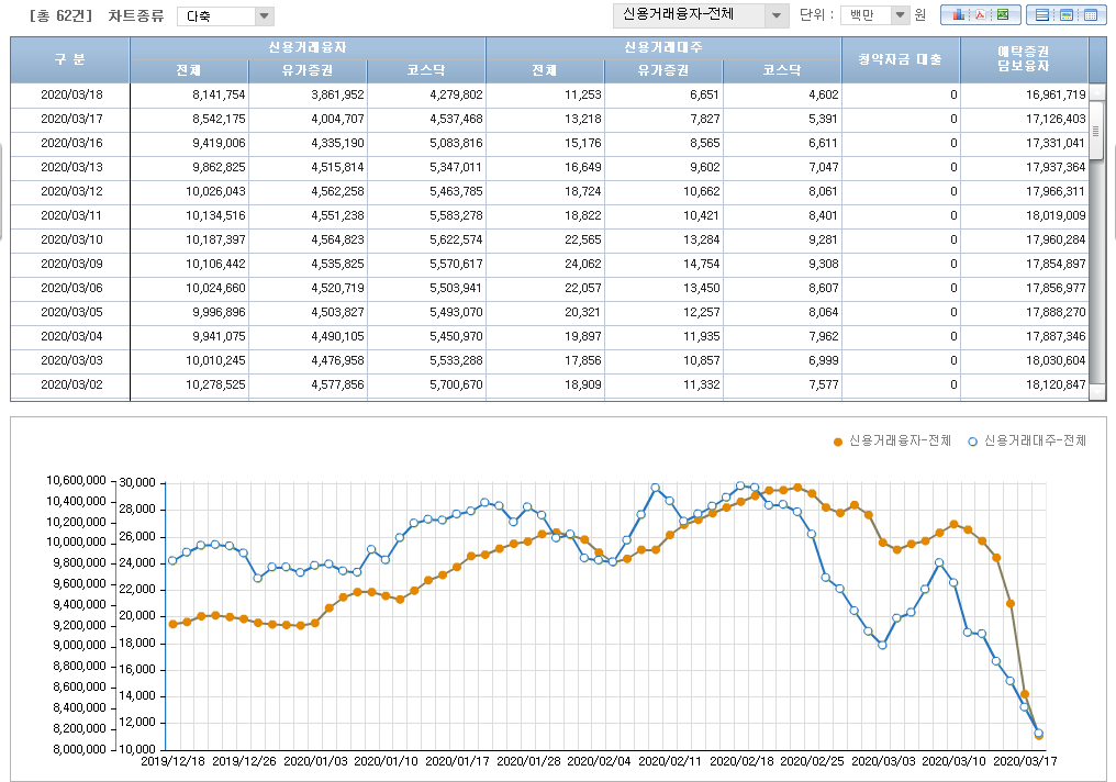 상황은 어떻게 흘러갈지 아무도 예측 불가능합니다. 관찰하고 기록하자면 장이 끝없이 추락하면서 신용거래 융자가 많이 줄어든 것을 오늘도 확인할 수 있었습니다.(http://freesis.kofia.or.kr/)