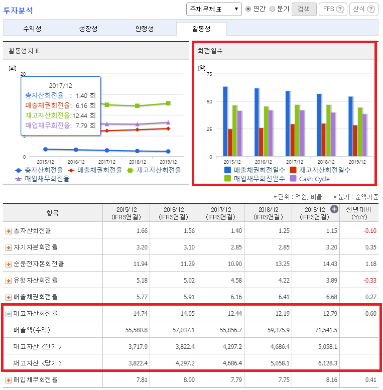 아래와 같은 화면에서 재고자산 회전일수 추이도 살펴볼 수 있습니다. 재고자산 회전일수 추이가 급격하게 증가하였다면, 그 이유를 확인하고 투자하는 것이 필요합니다.