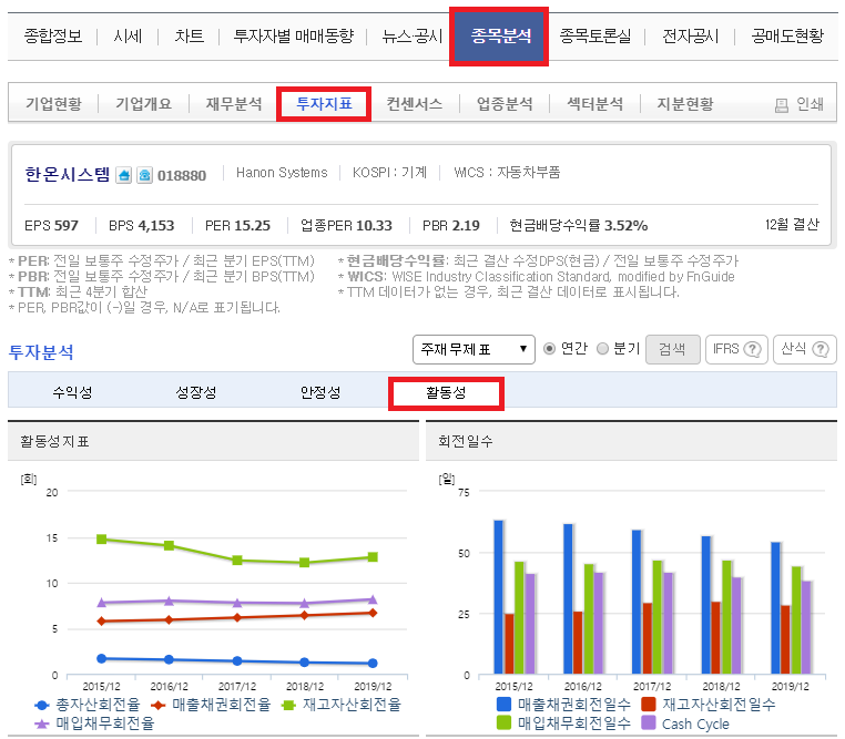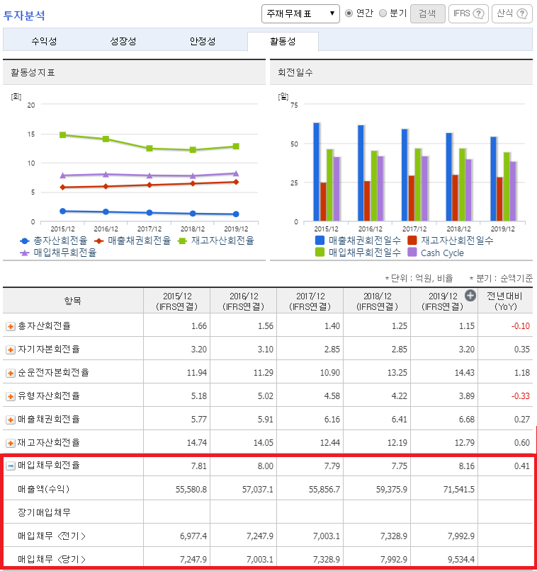 네이버증권 - 종목분석 - 투자지표 - 활동성을 클릭하시면 편리하게 매입채무 회전율을 보실 수 있습니다.