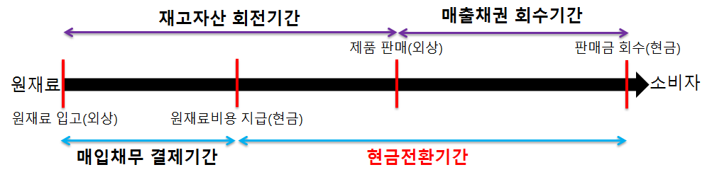 현금 전환기간은 기업이 원재료를 구입하는데 현금을 투입하여, 재료를 이용하여 제품을 제조한 뒤 매각하여 현금이 다시 기업으로 들어오는 데까지 걸리는 기간을 말합니다.