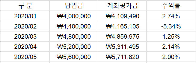 투자시작시점이 2020년 2월로 코로나바이러스로 인한 폭락장 직전에 투자한 것이기 때문에 짧은 투자 기록이지만 유의미한 것을 경험하였습니다. 주식이 -40% 정도 되었지만, 자산배분전략의 최대손실은 -10%정도였습니다. 매월 25일에 기록하는 성과는 -5%였습니다.