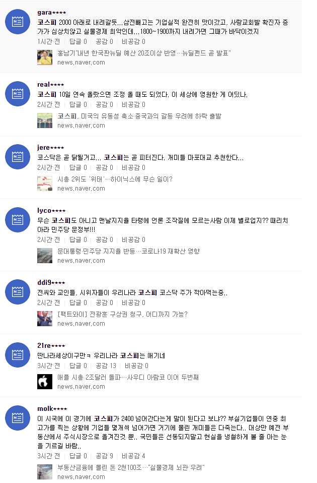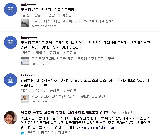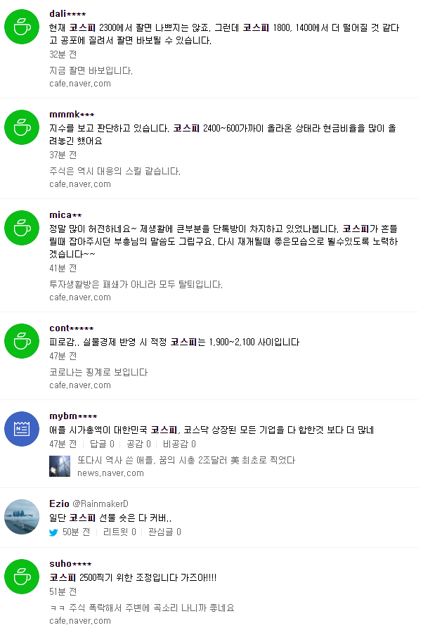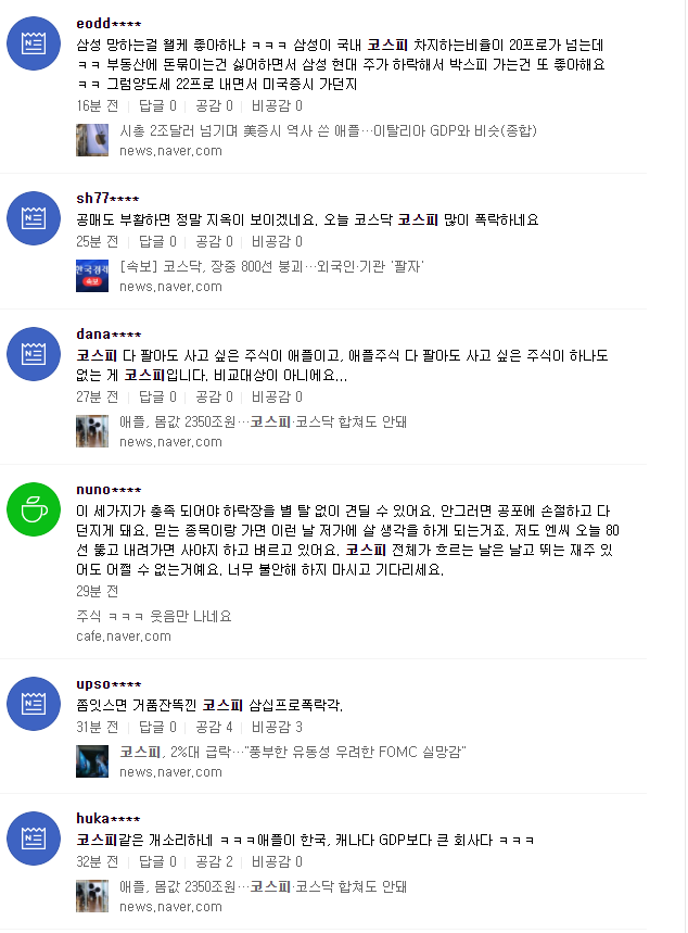 아래는 실시간 댓글인데 아직까지는 두려움과 확신은 많이 없어보입니다. 항상 주식시장에서는 겸손해야 하는 것 같습니다. 주식카페, 블로그에 개별주식의 수익을 자랑한 글이 많이 보였는데 썰물이 오면 누가 발가벗었는지 알 수 있듯이... 조심해야죠. 다양한 경험을 바탕으로 지혜로운 행동을 하기를..!