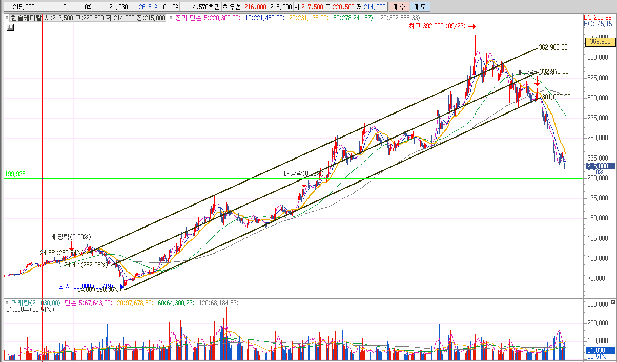 한솔케미칼은 추세가 급격하게 무너졌다. 28만 원을 방어선으로 보았는데... 지금은 사기에 충분히 매력적이라고 본다. 37만 원 이상에서 합리화가 아쉬웠던 종목, 일부 매도하였다면 수량을 늘리기 좋은 기회였겠다. 금융주를 매도하고 저점에 교체매매한 것은 나쁘지 않은 선택이였던 것 같기도하고...