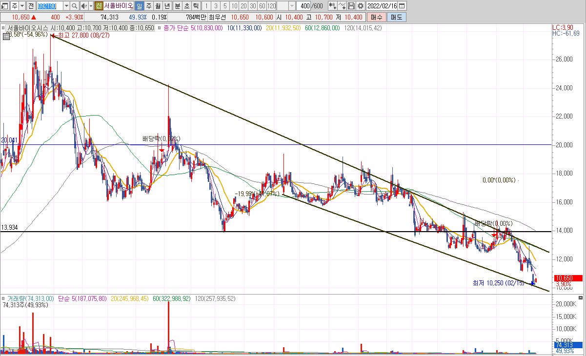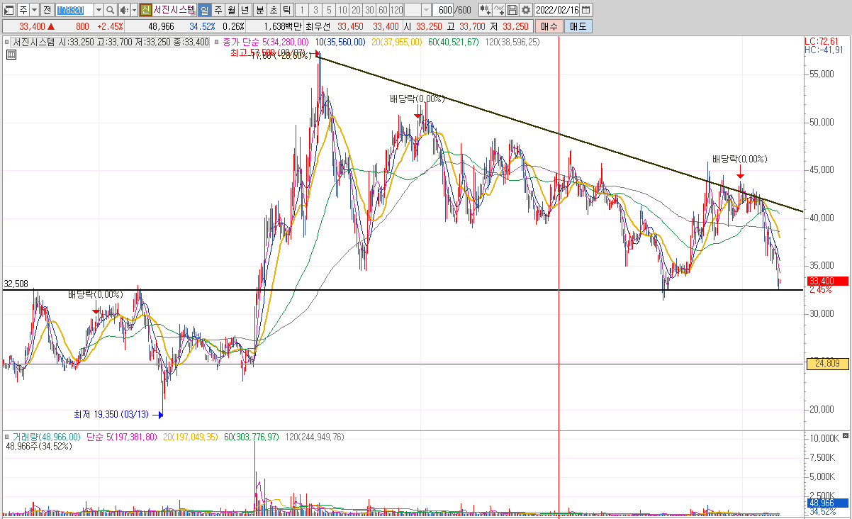 서진시스템의 경우도 조금 비싸게 샀다. 크게 하락하였으며 지지선과 과거저항선이 모여있는 곳에서 지지를 받고 있다. 시장이 무너진다면 이것도 깨지겠지만, 사기 좋은 위치라고 생각한다.