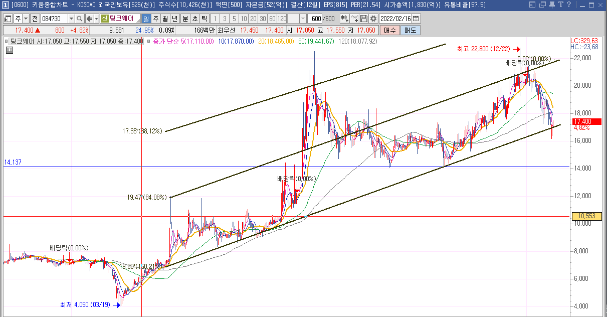 팅크웨어의 경우 스케쥴들이 좋아서 조금 비싸게 샀지만, 추세를 거의 지켰다. 핵심도 하단에 와있어서 사기에도 나쁘지 않아 보인다.