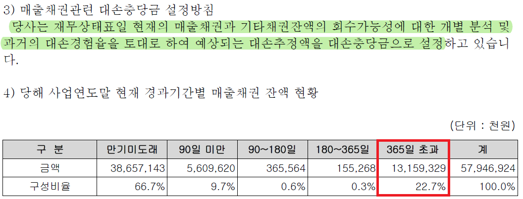 대손충당금의 크기는 매출채권의 규모에 비레합니다. 대손충당금 금액을 매출채권 규모로 나눠보면, 대손충당금 설정비율을 알 수 있습니다. 당기 대손충당금 설정비율이 업종평균 또는 과거평균에 비해 너무 높거나 낮은경우 너무 과하게, 혹은 너무 작게 추정하지는 않았는지 검토해야 합니다.