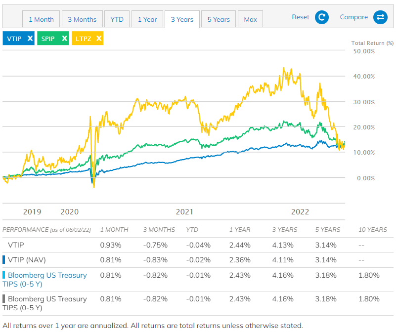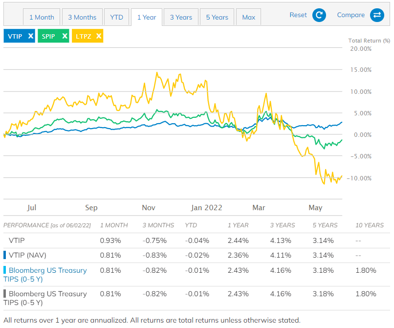 미국에 상장된 단기 물가연동채권의 퍼포먼스를 확인해보자. 확실히 금리 인상기를 지나왔지만 장기 물가연동채권같은 급격한 하락은 없었다. 오히려 단기적으로 인플레이션에 대한 불안감이 있다면 단기 물가연동채 VTIP 를 매수하는 것이 바람직해보인다. 포트에서 리크스 분산을 위해 편입한다면 중장기 물가연동채권도 그 나름의 쓰임을 할 것이다. (VTIP가 단기, SPIP이 중기, LTPZ가 장기)
