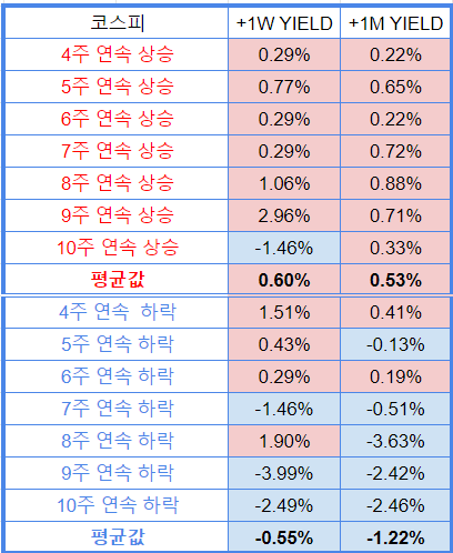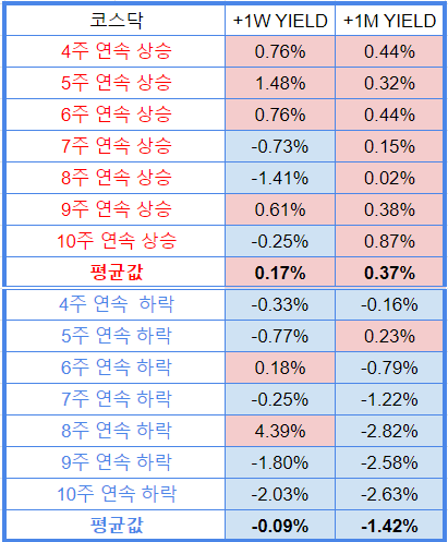 코스닥은 10주연속 상승한 적이 딱 1번 있다. 26년동안 말이다. 통계적으로 조정이 나올때가 되었으며 1~2주는 강한 저항선을 뚫기에는 어려워 보인다. 다만, 통계적으로 보았을때 연속상승시 1개월 수익률은 추세를 따라갔기에 인버스는 단기로 봐야겠다. 이는 코스피도 마찬가지다.