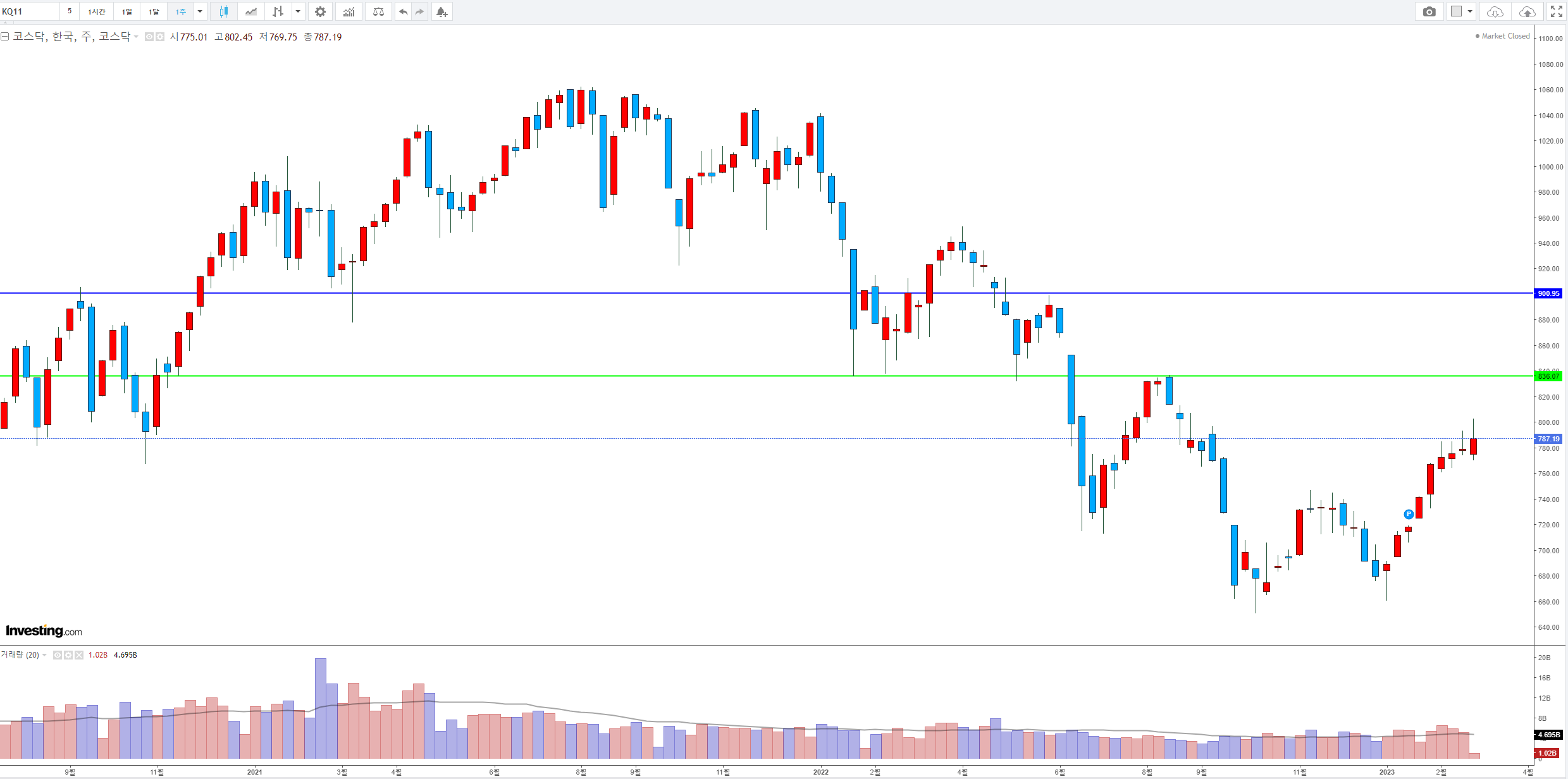 주봉으로 보아도 9주간 연속상승이 굉장히 눈에 띈다. 백테스트를 해보지 않았지만(해봐야겠네! -> 03.04~05 주말동안 힘들게 했다) 굉장히 이례적인 연속상승이라고 볼 수 있을 것 같다. 830선에서는 의미 있는 비중으로 인버스를 매수할 계획이다.