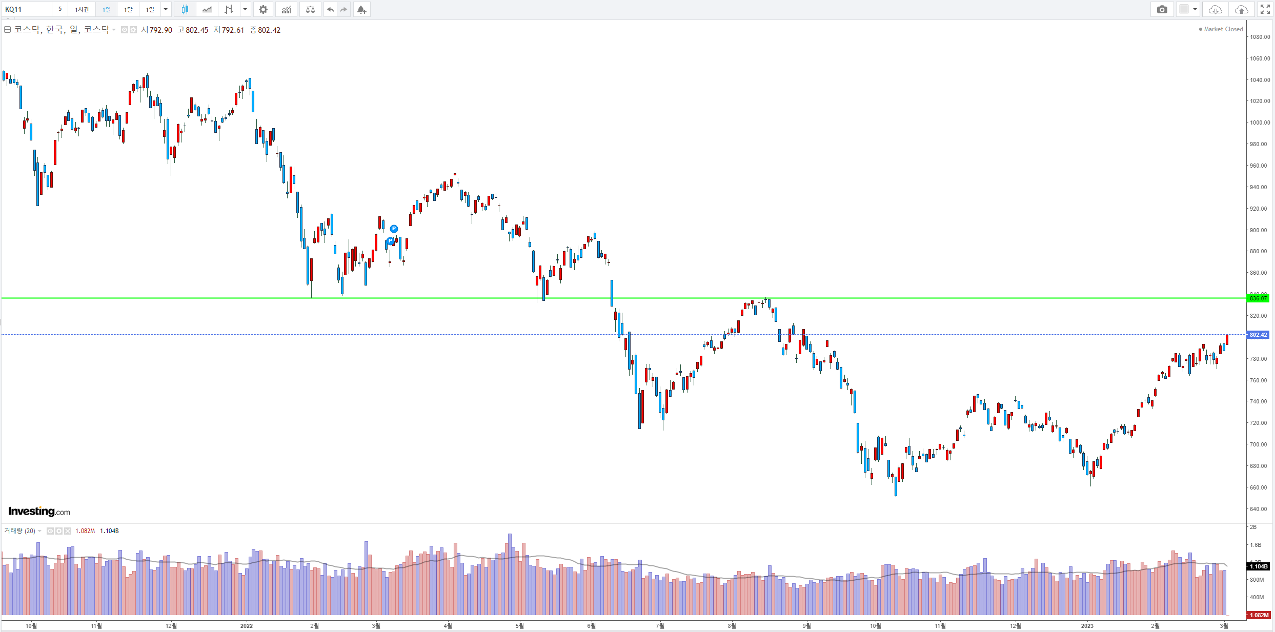 무튼 저번주에 코스닥 800선에서 인버스를 매집하였다. 이유는 최근 테마주가 급등하면서 더러 지수도 올라버렸고, 상대적으로 아웃퍼폼하였기 때문이다. 강력한 저항이 830이고 800은 심리적인 저항이라 생각하여 매수하기 시작하였다.