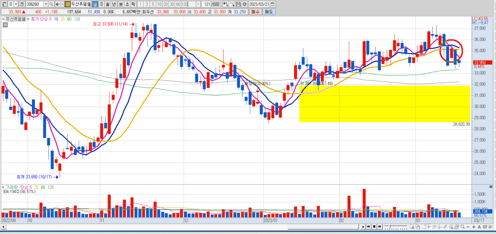두산퓨얼셀 : 이평선 역배열, 20일 이평선 못 뚫음, 무거운 이평선 저항, 최근 높은 공매도 거래비중, 최근 거래량 낮음, 횡보기간이 적당하지만 밑에 지지선이 있어 공간, 기대수익률이 낮음, 외국인이 매수주