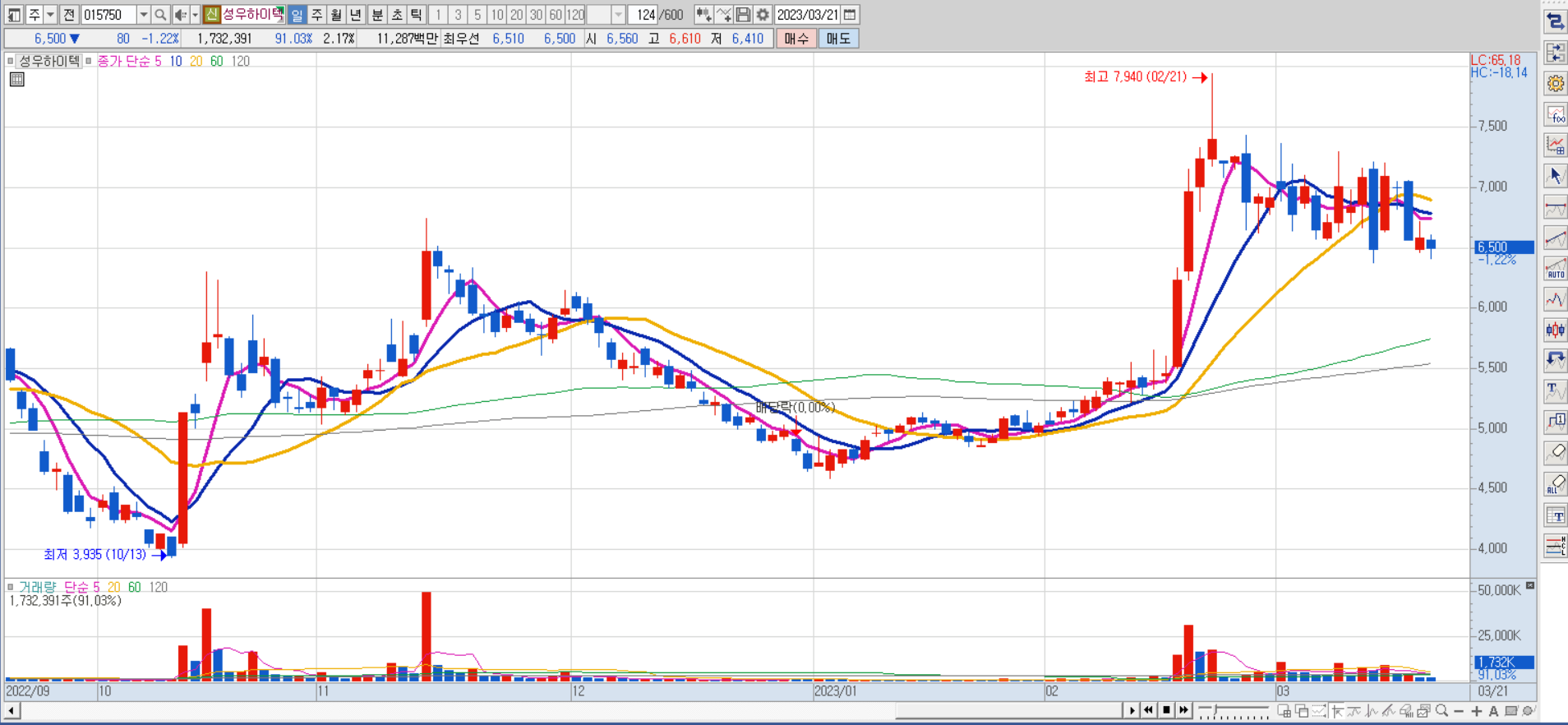 성우하이텍 : 이평선 역배열, 20일 이평선 못 뚫음, 무거운 이평선 저항, 최근 높은 공매도 거래비중, 최근 거래량 낮음, 횡보기간이 짧은 것은 아쉬움, 개인이 매수주체, 섹터과열양상