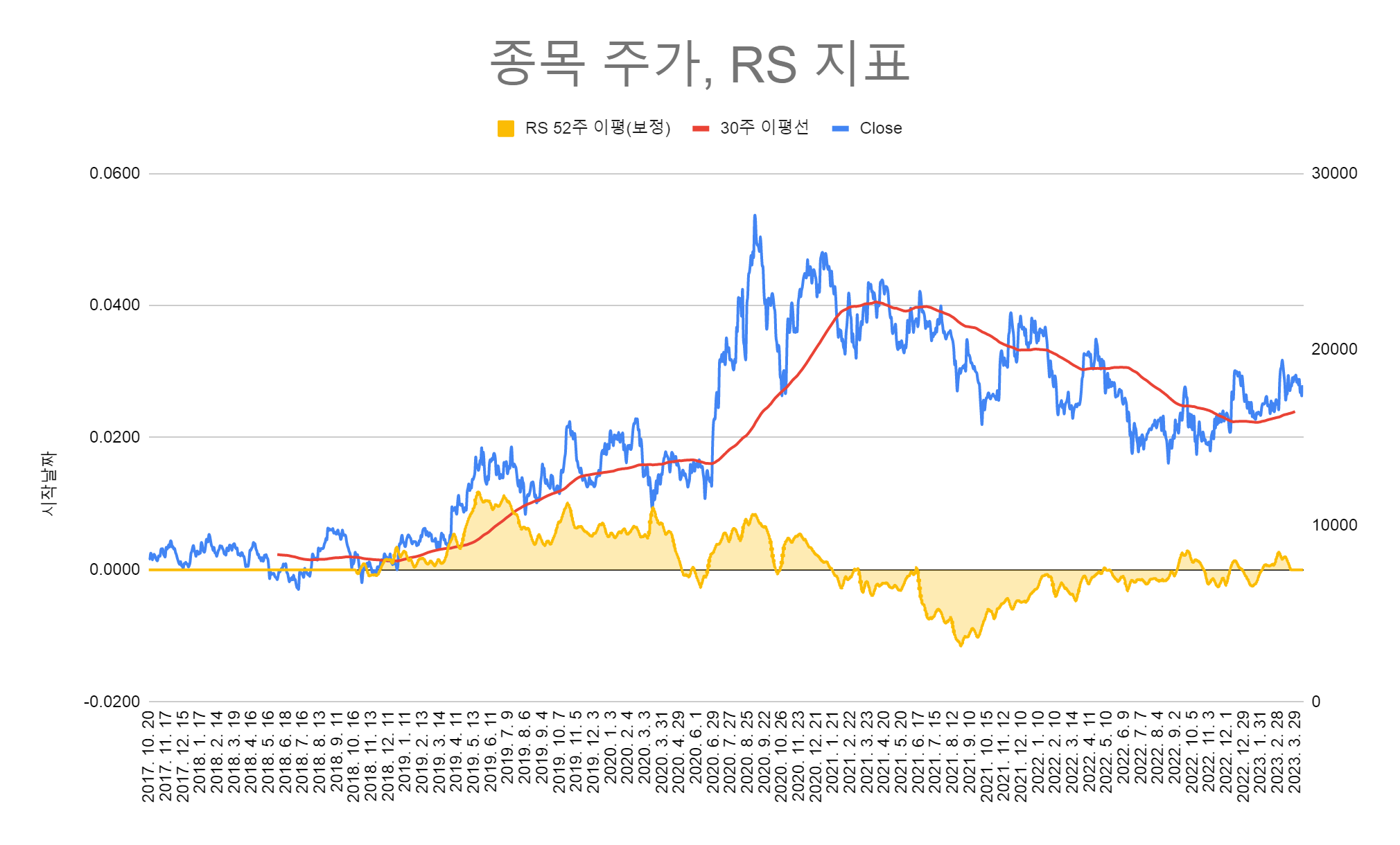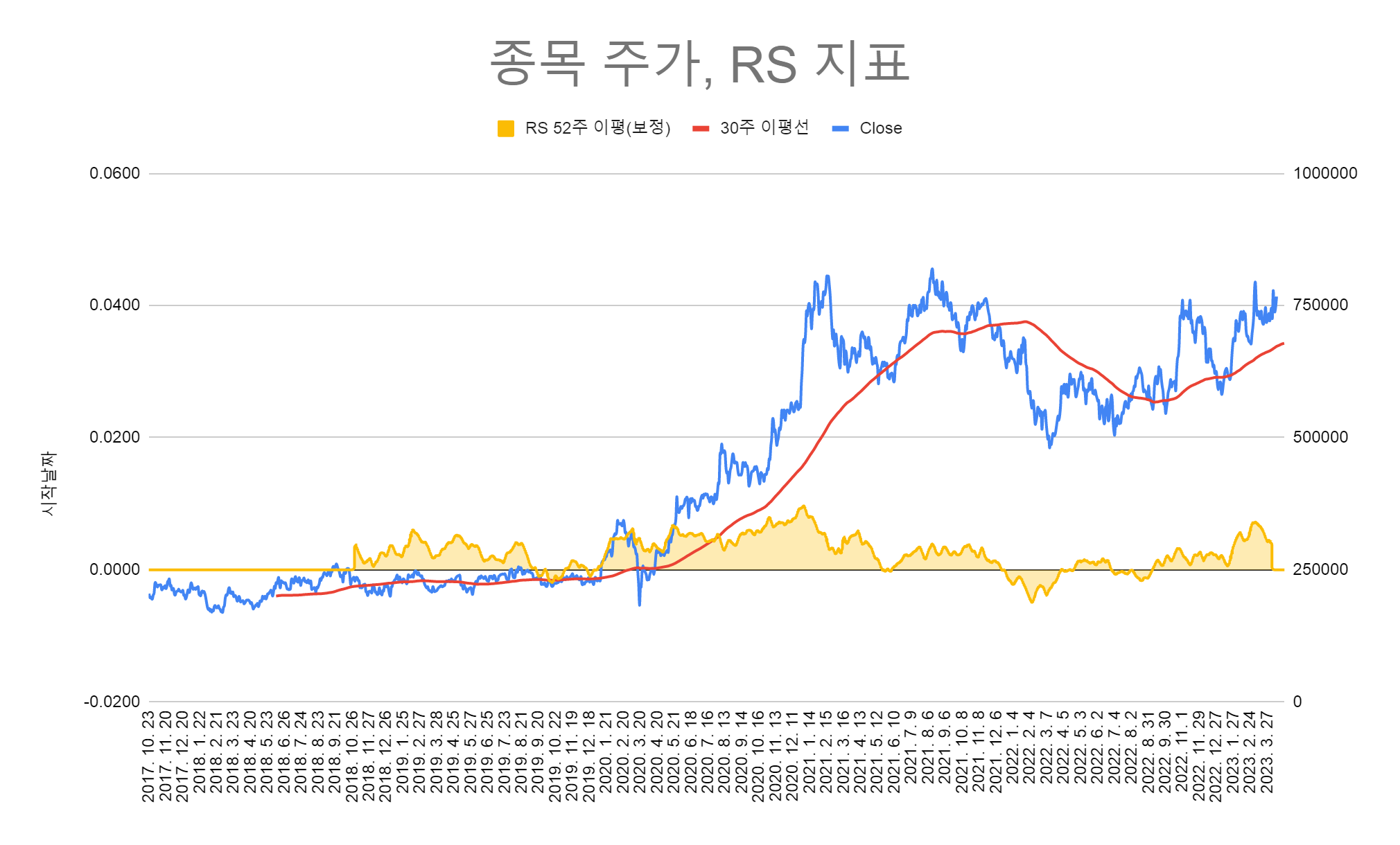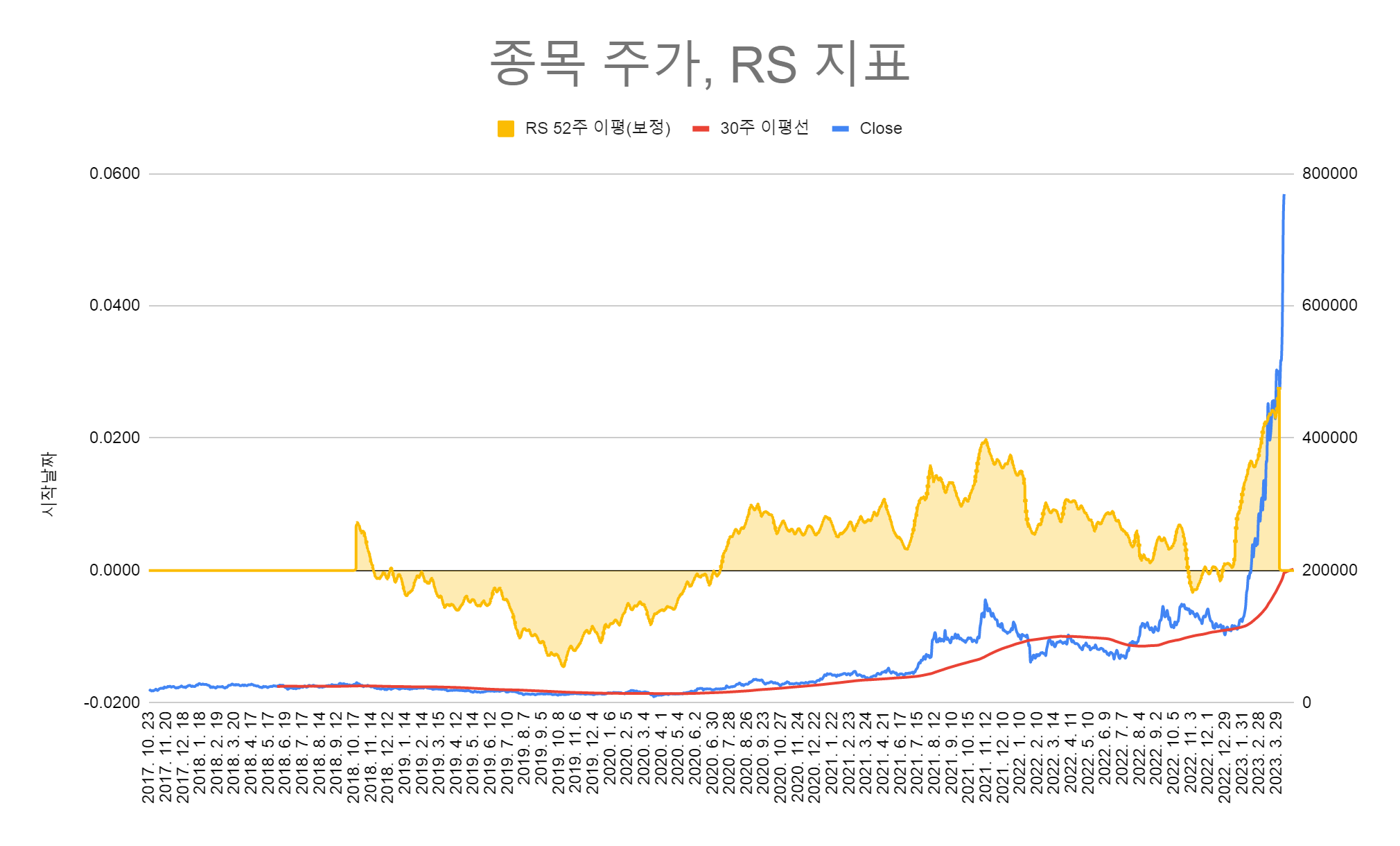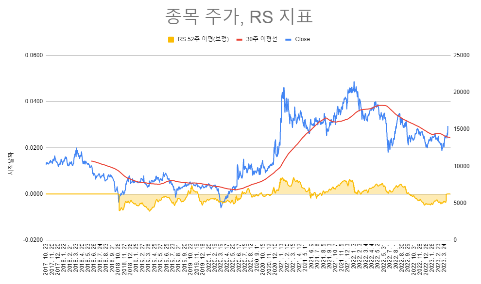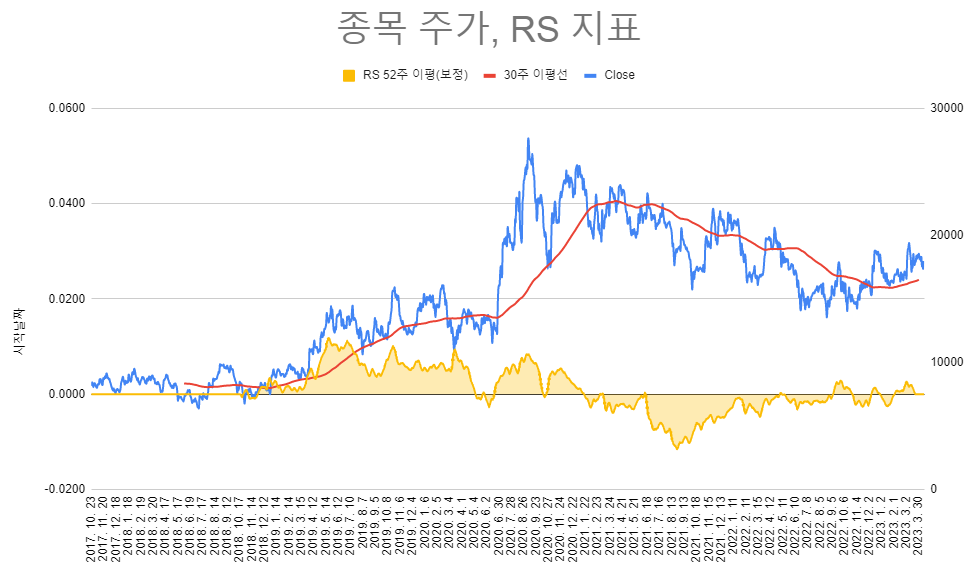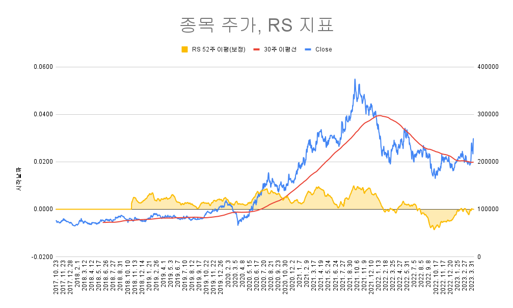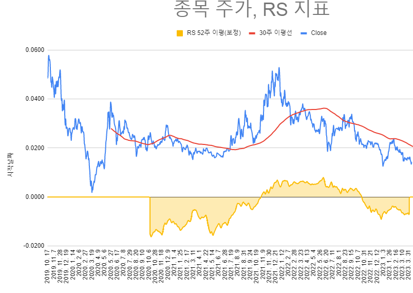 그것을 캐치하는 중요한 지표가 RS(Relative strength, RSI와는 다름) 지수와의 상대적 강도를 나타내는 지표이다. HTS에서는 지원이 안되고, 사용자 함수로도 만들 수가 없었다. 그래서 스프레드 시트를 통해서 고민고민하면서 수식을 만들었고 문제점을 보완하여 비슷하게 구현을 하였다. 차트와 함께 만져볼 수가 없어서 굉장히 불편하지만... 그러면서 또 많이 배웠다. 어디까지나 상대강도이기 때문에 지수보다 강하다는 의미를 내포하였다. 높다고 해서 상승하는 것은 아니다. 정확한 것도 아니고 내 나름의 잡스킬로 구현을 하였는데 뿌듯하다.