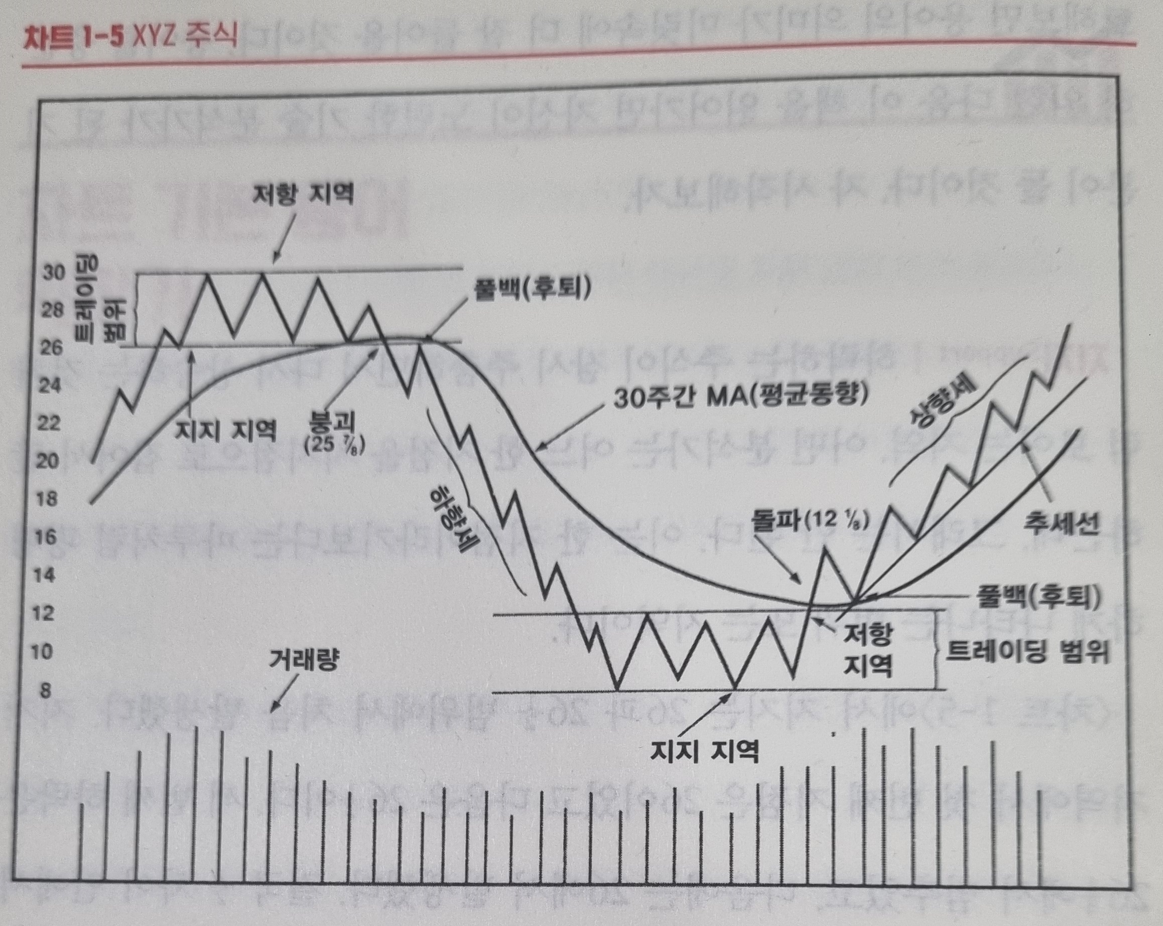 지지선 아래 주가가 머문 시간이 길면 길수록 돌파는 더욱 큰 영향을 끼친다. 돌파 시점에 주식 물량이 크게 늘어나면 상승세는 더욱 거세진다. 붕괴는 돌파의 반대. 돌파 때와 달리 붕괴할 때 꼭 양이 늘어나는 것은 아니다. (주식은 그 자체의 무게로 하락)