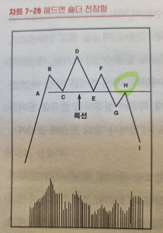마지막으로 다음 하락(F-G)은 목선 아래에 주식을 가져다 놓는다. 이 시점에서 잠재적인 헤드앤숄더 천장형이 현실이 된다. 이것은 가장 비관적인 약세 패턴이다. 따라서 만약 당신이 그렇게 헤드앤숄더 패턴이 완성된 주식을 보유하고 있다면 희망하지도 말고, 기도하지도 말고 즉각 매도하라. 만약 다른 조건이 맞는 다면, 해당 주식을 공매도하라.