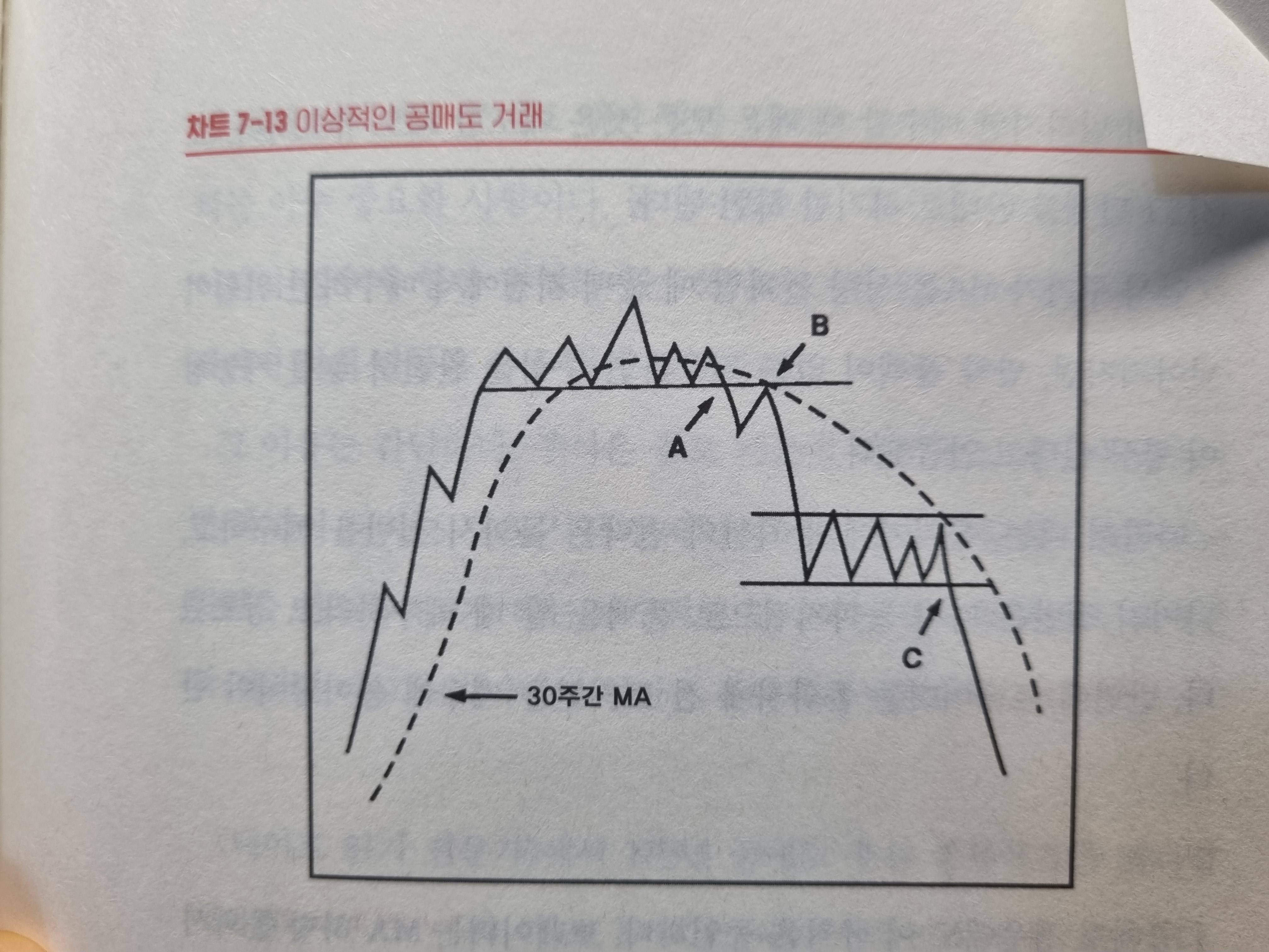 MA가 상승하는 한 당신은 공매도를 고려하지 말아야 한다. 그러나 MA가 수평을 이루고 최고점이 완성된 후 크게 하락할 가능성이 높아졌다. 투자자는 초기 주가가 MA를 하향 돌파할 때 절반을 매도하고 주가가 다시 반등을 보이고 하락 돌파했던 지점에서 나머지 절반을 매도하면 된다. 각각 A와 B 지점이다.