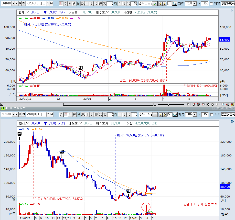 SK아이테크놀로지는 신규상장 후 주가가 흐르기만 하였는데 4월에 거래량이 터지면서 의미 있는 상승을 보여주었기에 관찰 중 풀백이 나온다면 매수를 할만하다고 보고 있다. 풀백이 나와주지 않는다면 베이스 조정을 확인해봐야 한다. (7W 29/11 2T, 거래량 감소확인)