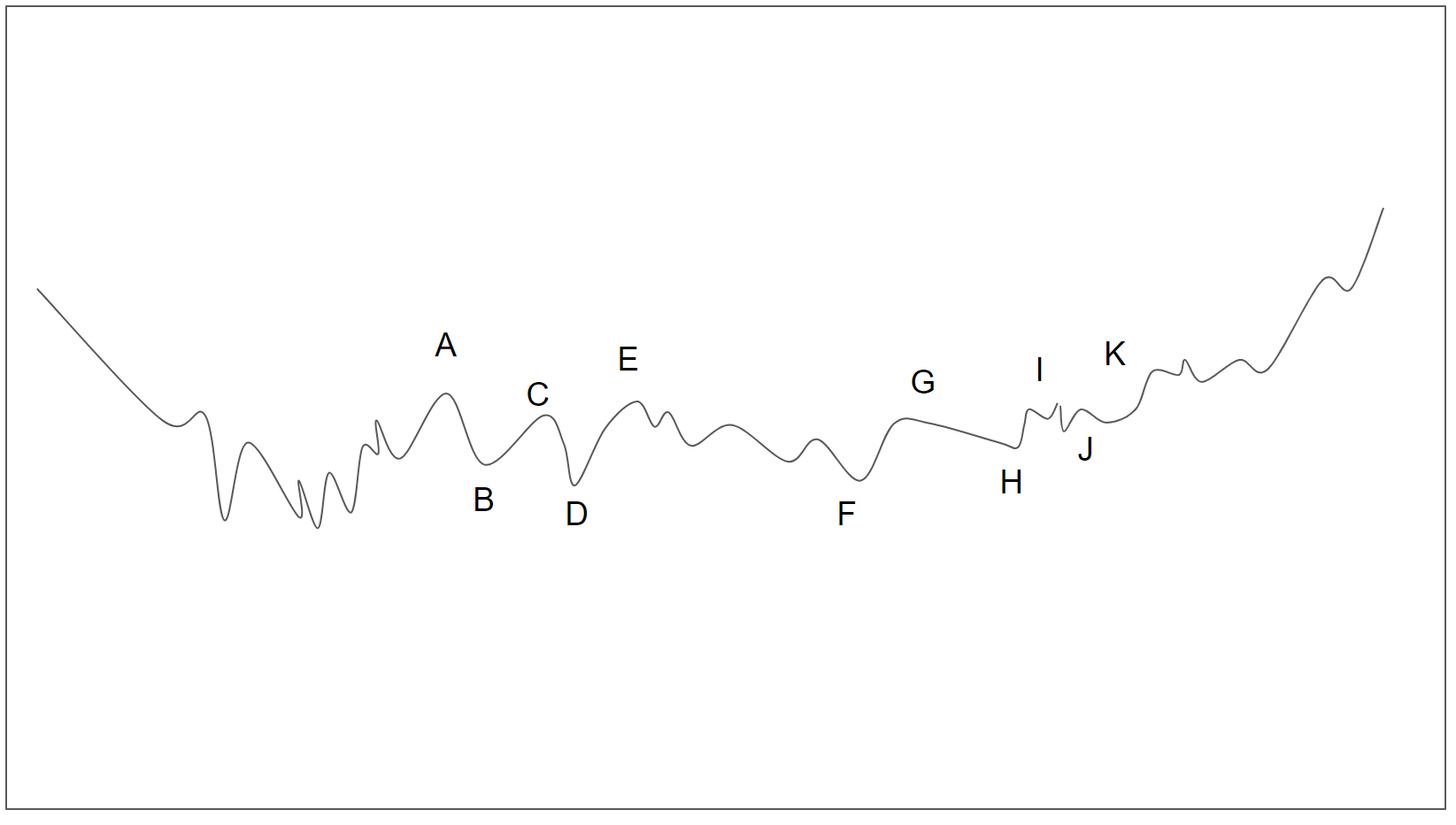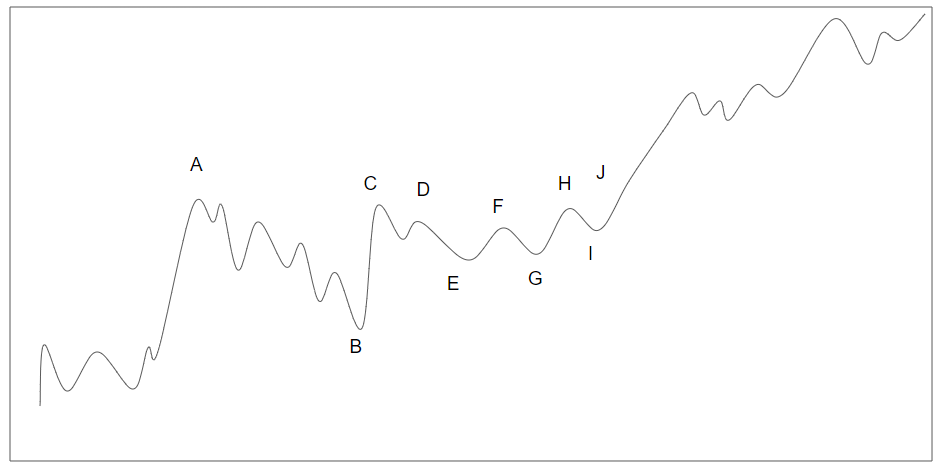 A , B , C 지점까지의 과정은 너무 길고 느슨하다. 하락폭도 비정상적으로 크다. B-C지점 사이에서도 되돌림 없이 곧장 올라갔다. C,D 지점바디 신고가 셩신에 실패. H지점에 이르러서야 길고 느슨한 형태의 손잡이가 달린 컵 모양을 뚫고 올라가려는 시도를 하게 된다. 마침해 H, I, J 지점에서 짧고 단단한 모양의 컵을 만들게 된다. (실제 그래프에서는 J에서 손잡이가 형성)