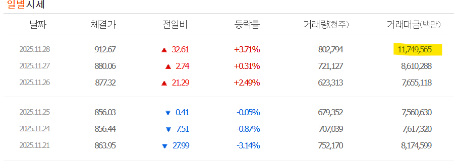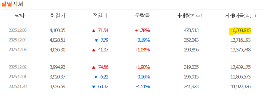 현재 포트의 약 70% 정도가 반도체 쪽이며 나머지가 현대오토에버와 방산친구들이다. 오토에버를 보면서 느끼는 것이지만 큰 거래대금 신호는 굉장히 포텐셜이 있다고 본다. 국장에서 1조의 거래대금(5천억만 되어도 엄청난 것이지만)은 특히 무시하면 아쉬운 경우가 굉장히 많았고 승률도 높은 편이다. 한국의 거래대금은 활황일 때 20조 이상, 조정일 때 10조 이상정도이다. 그중 일부는 삼성전자와 하이닉스가 담당하기 때문에, 1조의 거래대금이 의미하는 바는 굉장히 크다. 큰 자금이 해당 종목을 보고 있다는 방증이라고 보고 있다.현재 현금포지션은 0 이므로 추가적으로 매매할 것은 크게 보이지 않는다.