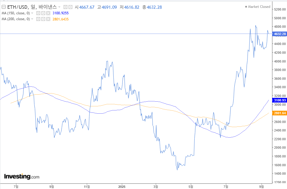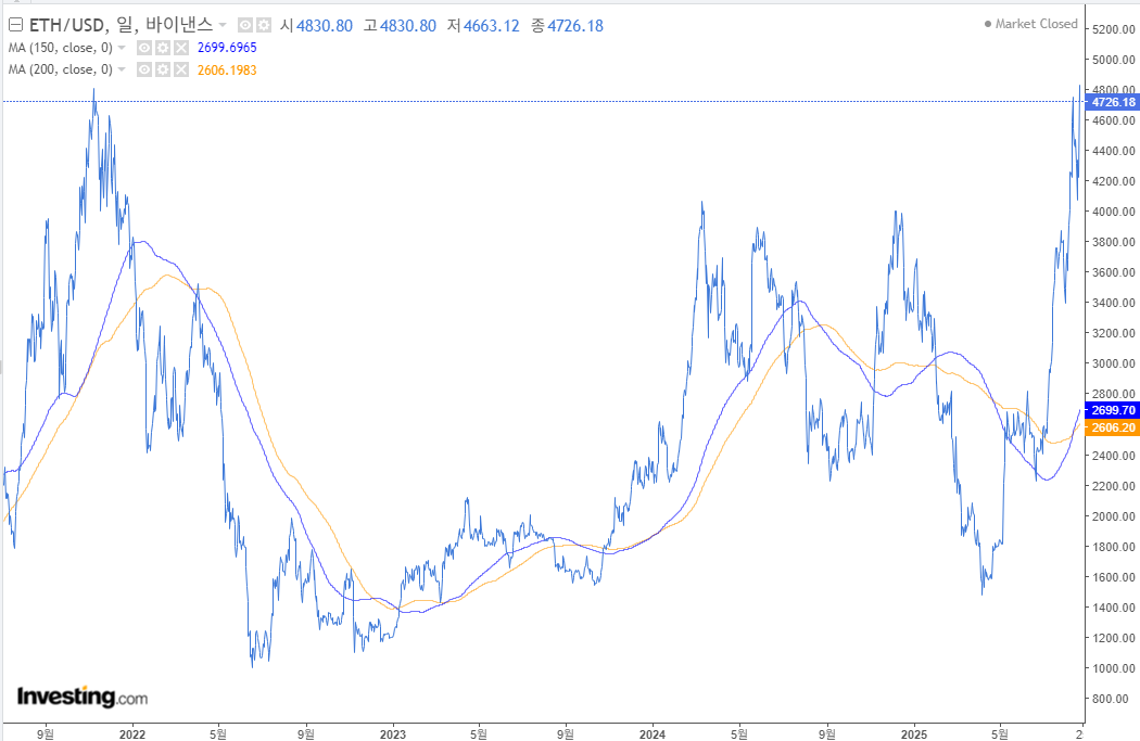 5. 가상자산 : 나스닥과 같이 시들시들하다가 아주 좋은 흐름으로 전환하였다. 특히 이더리움은 상당히 강하다.