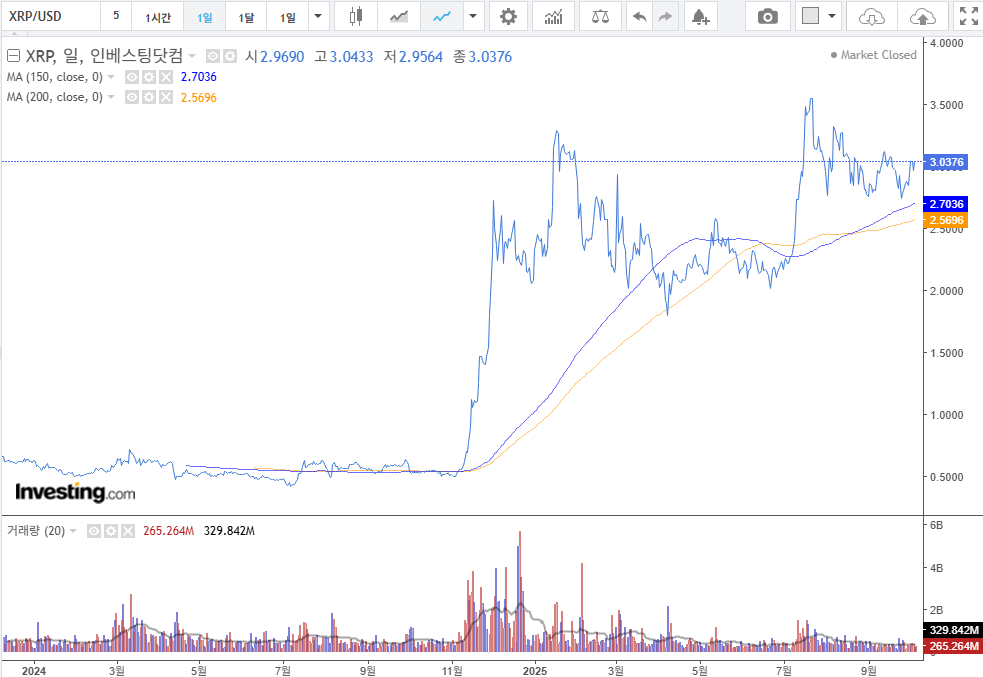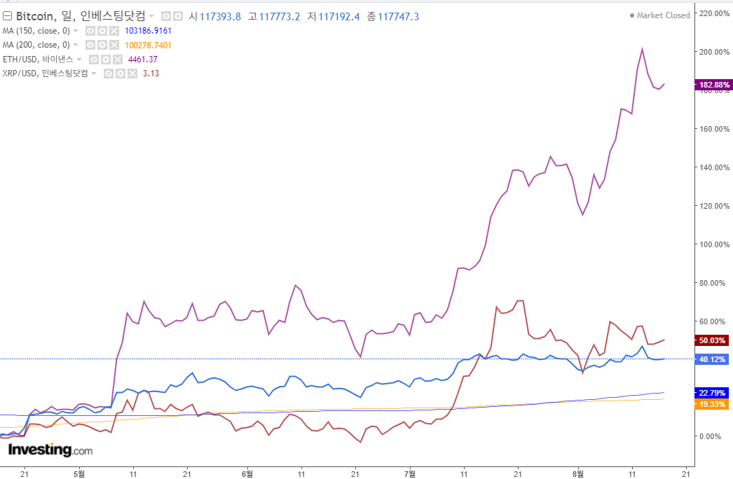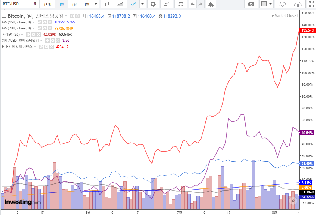 비교해서 보면, 최근 3개월 강도는 ETH가 가장 강력하였다. 7월 중순 이전에는 XRP가 어느정도 따라오는 수준이였으나, 8월 이후에는 ETH가 더 치고 올라가는 모습이다. XRP의 50% 정도 ETH로 포트폴리오 교체해야겠다. 거래대금도 7월 중순부터 지속적으로 우세한 모습이다.
