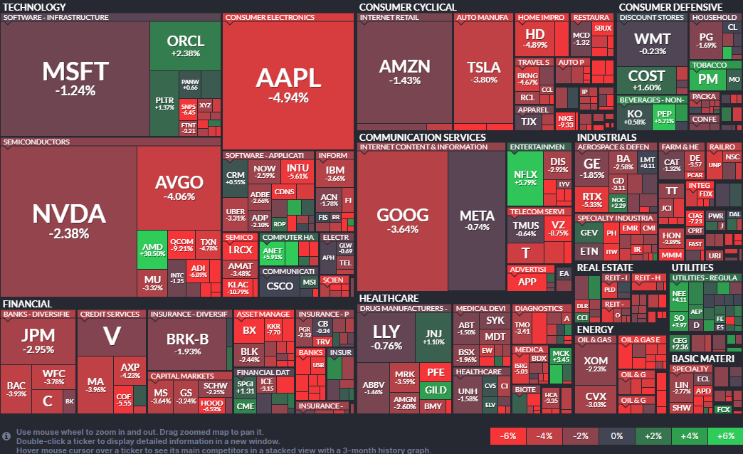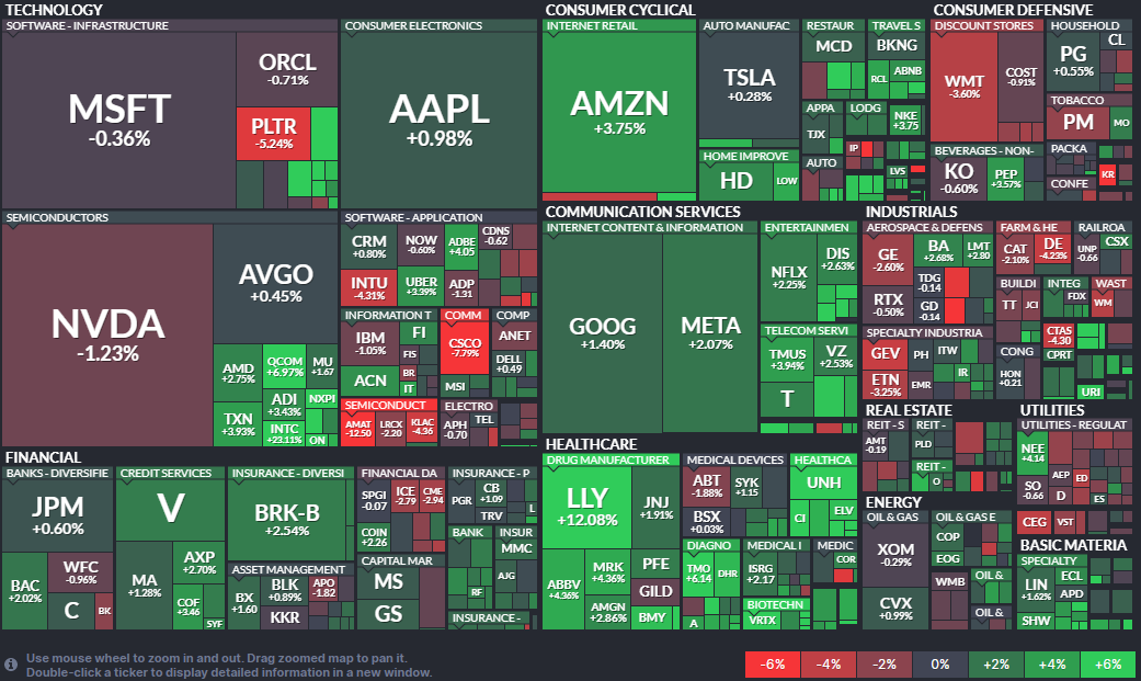 구글과 애플의 상승이 눈에 띈다. 그리고 엔비디아, 마이크로소프트, 팔란티어 하락