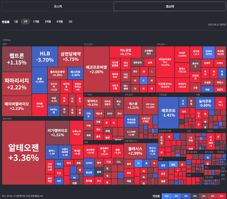 2. 미국 : 반도체 슈퍼사이클 이야기가 나오는 만큼 조정 시에 반도체 주식을 매수하는 것이 의미 있다고 보고 있다고 보았다. 마이크론이 돌파할 때 교체매매를 이것저것 하였다. 현재 미국장이 가장 강하다. 4월이 변곡점이었으며 6월 돌파가 그것을 증명하는 때였다. 짧은 기간 성과가 아쉬웠다고 포트에서 퇴출하면 그 이후로 상승할 수 있는 리스크가 있는 장으로 판단된다. 가장 큰 리스크는 투자를 안 하는 것? 같은. 헬스케어 쪽은 차트가 상대적으로 안 좋아서 잘 안 보는데 일주일 성과에서 눈에 띄는 초록색이다. 아스테라 랩스/씨게이트/마이크론 테크놀로지/램리서치/팔란티어/아이온큐/로켓랩/테슬라/로빈후드/앱플로빈/아이렌/블룸에너지이오스 에너지